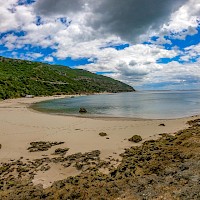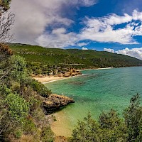 De seguida rumamos à praia do Monte Branco sempre com a Pedra da Anicha no horizonte. Após essa passagem entramos num trilho técnico que nos dará acesso à praia dos Coelhos uma das praias selvagens mais bonitas da região. Aqui faremos mais uma pausa. De seguida voltamos aos trilhos e faremos o percurso que dá acesso à praia de Galapinhos, outro dos ex-líbris da região e que é frequentemente considerada uma das praias mais belas da Europa. Após esta última pausa iniciamos rumo a norte o regresso ao nosso ponto de partida tendo sempre a serra e o mar como pano de fundo.