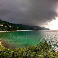 De seguida rumamos à praia do Monte Branco sempre com a Pedra da Anicha no horizonte. Após essa passagem entramos num trilho técnico que nos dará acesso à praia dos Coelhos uma das praias selvagens mais bonitas da região. Aqui faremos mais uma pausa. De seguida voltamos aos trilhos e faremos o percurso que dá acesso à praia de Galapinhos, outro dos ex-líbris da região e que é frequentemente considerada uma das praias mais belas da Europa. Após esta última pausa iniciamos rumo a norte o regresso ao nosso ponto de partida tendo sempre a serra e o mar como pano de fundo.